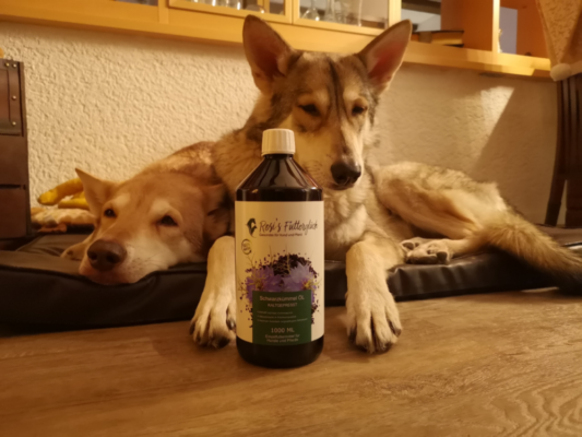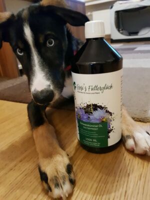 Pro 10 kg Körpergewicht sollten 1,5 g Schwarzkümmelöl an den Hund verfüttert werden.